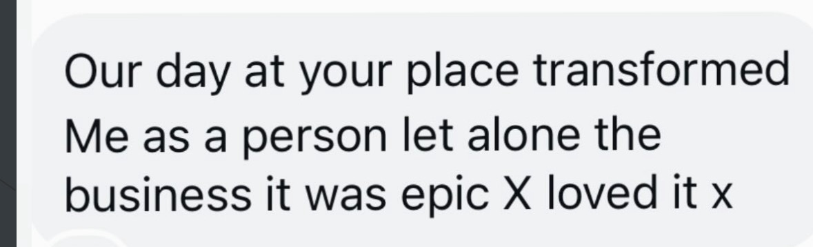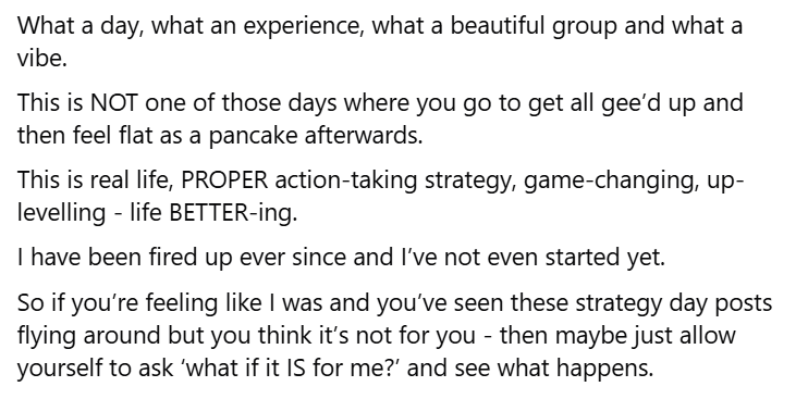 "It was such a brilliant day and it was so valuable to get to talk about our businesses with you and bounce things around with each other. We've established a lovely little group and are keeping in touch on WhatsApp, so another bonus of coming! I definitely came away feeling more confident with my thoughts and plans, giving me the reassurance I needed; as a solopreneur, your ideas can easily run away with you, or I often confuse myself and start to overthink or go around in circles. And I've not done that again once since having the day with you - so thanks for that! I think my husband is pleased that I'm just cracking on rather than bending his ear with another... "What if I did this" conversation!